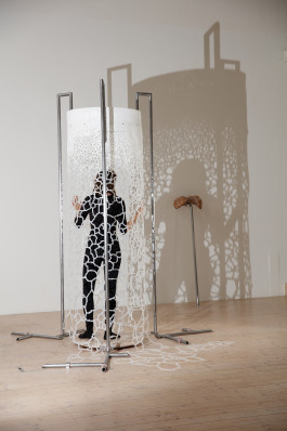 my body is not another patriarchy reproductive machine, 2025, Bügelperlen, Kalkstein, Stahl, 270x170x170 cm