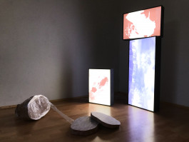 Julia Dietrich und Martin Lehmer setzten sich formal in sehr unterschiedlicher Weise mit dem Thema Heimat auseinander. So wird bei Dietrich die Skulptur einer überdimensionierten, zerschnittenen Blutwurst zum Symbol des Heimatbezugs. Sie versinnbildlicht vielschichtig die welchselhaften emotionalen Eindrücke, die die Künstlerin mit den Hausschlachtungen auf dem Hof der Eltern, auf dem sie aufgewachsen ist, in Verbindung bringt. Auch Martin Lehmer beschäftigt sich in seinen Arbeiten mit Prozessen der Zerstückelung und Auflösung. Er zerlegt, einem Prisma ähnlich, voralpenländische Bergformationen, Bilder aus den Gegenden und Landschaften seiner Kindheit und Jugend. Im Motiv des Kuhschädels entsteht darüber hienaus ein inhaltlicher Bezug zu den Steinobjekten Dietrichs. Dieser stellt zugleich die visuelle Klammer dieser sehr persönlichen, künstlerischen Reflexion des Duos mit diesem Begriff dar.