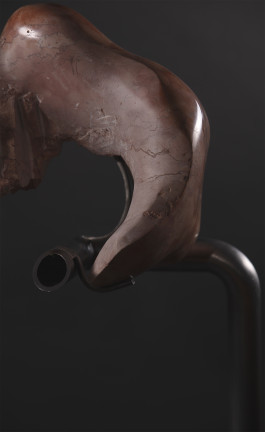 Doch innerhalb dieser Anordung entsteht Spannung: die Stahlvorrichtung schreibt sich mit Widerstand in die innere Form der Skulptur ein. Der Stein übt gleichzeitig durch seine Masse Druck auf die Konstruktion aus, bringt sie durch die Bewegung und Betrachtenden von außen manchmal sogar zum schwingen.