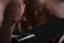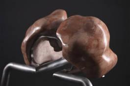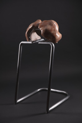 An der einen Seite gibt sie den Blick in ihr Inneres frei. Wehrhaft und doch verletzlich scheint die an der Oberfläche glatt und anschmiegsam geschliffene Form auf der Konstruktion ihren Platz gefunden zu haben. Vielleicht wollen wir den Stein berühren, ertasten, spüren..